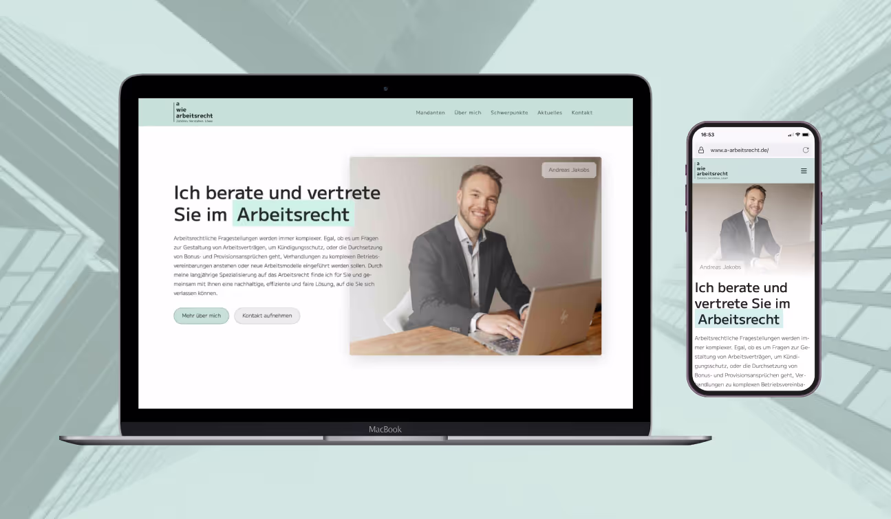 Für den Fachanwalt für Arbeitsrecht Andreas Jakobs habe ich Anpassungen am Brand Design vorgenommen und eine neue Website konzipiert, gestaltet und umgesetzt.